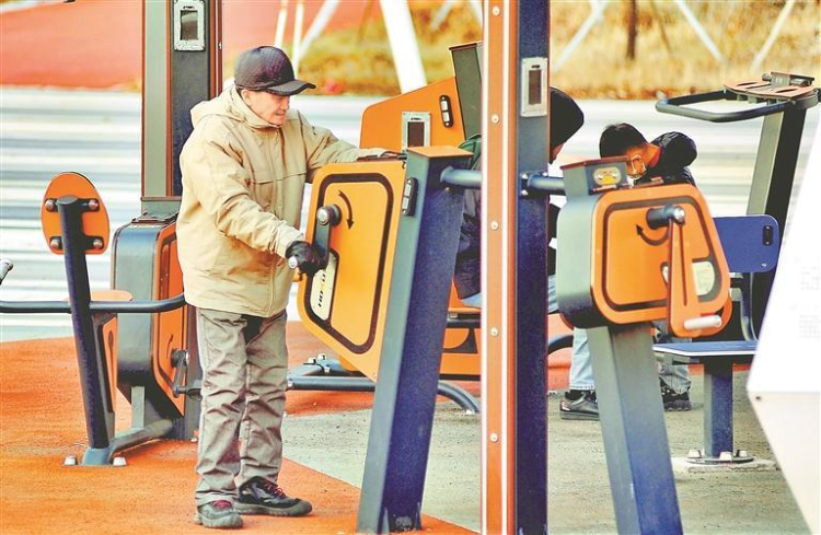 11月4日,哈尔滨市道里区兴江南路附近的何家沟畔小广场上,几位老人在室外智能健身房锻炼身体。这处新投用的公益“健身房”采用太阳能供电,具有体质检测、数据查阅等功能,成为附近居民锻炼健身的好去处。(记者 苏强摄)