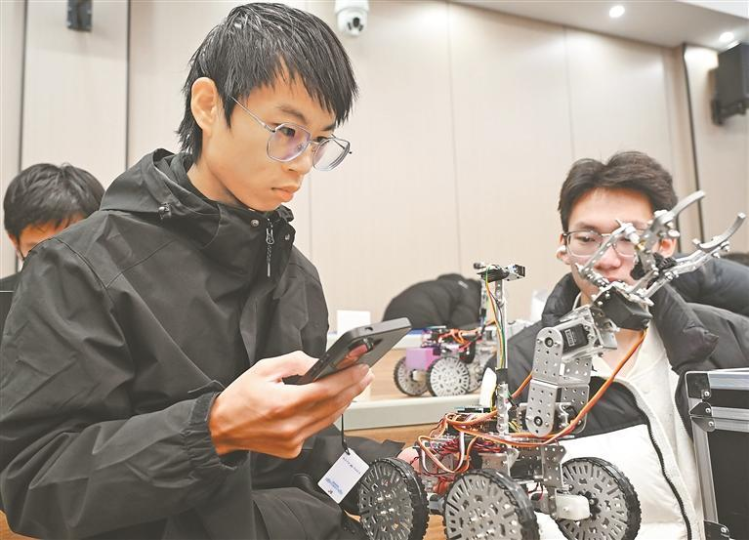 赛前,参赛选手调试机器人。记者 郭俊峰摄