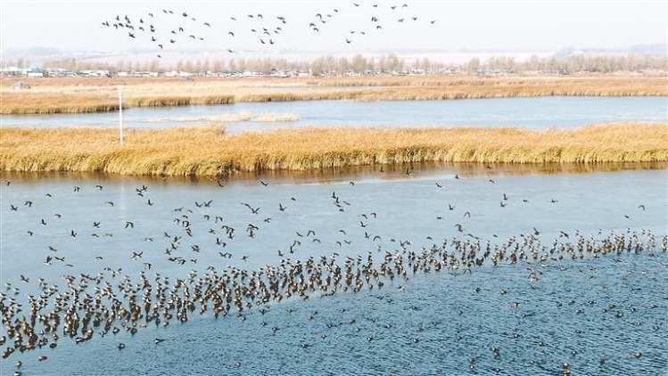 眼下,位于肇东市的千鹤岛秋季候鸟栖息期已进入尾声。自10月中下旬起,大批候鸟陆续飞抵此处停歇补给,其中鹤类种群“来得早、走得早”,而绿头鸭、大麻鸭、花脸鸭等野鸭则为较晚抵达的主力种群。长期以来,千鹤岛凭借优良的生态环境,成为候鸟南迁途中的重要“驿站”,各类候鸟在此短暂休整、补充能量后,会继续前往南方越冬。(刘宪武摄)