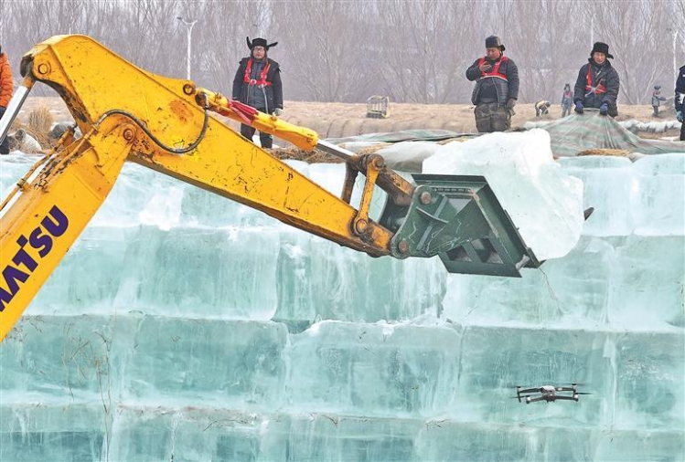 据了解,当下松花江仍没有封冻,存冰的顺利启用可以让园区提前开始冰建建设。随着存冰入场,近万名冰建工人陆续投身景观建设,一个全新的梦幻童话世界将在120万平方米的园区“梦想成真”。(记者 张澍摄)