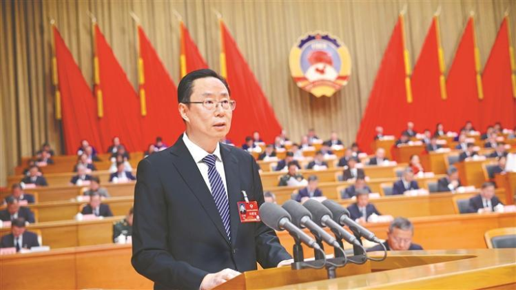 韩立华代表政协黑龙江省第十三届委员会常务委员会,向大会报告省政协十三届三次会议以来提案工作情况。黑龙江省政协十三届三次会议共收到提案1137件,经审查立案992件,立案提案均已经办复,为黑龙江省高质量振兴发展贡献了智慧力量。