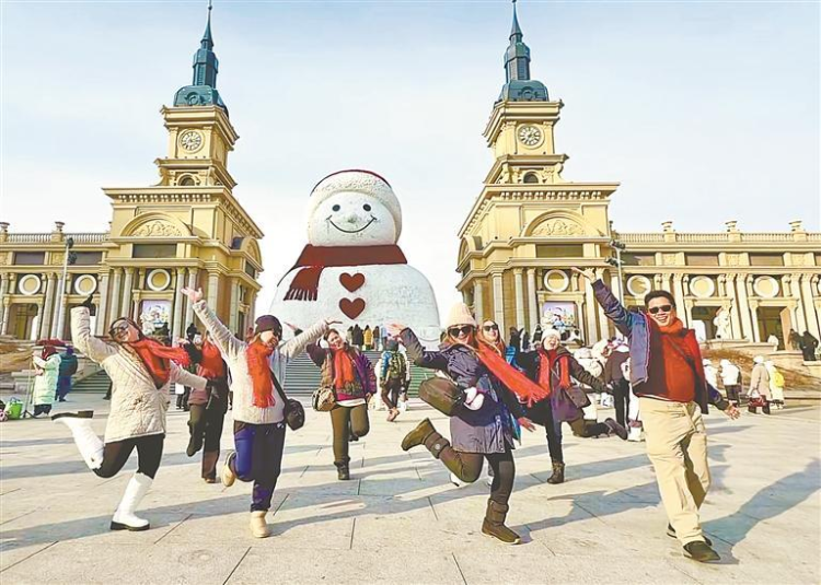 图③:来自菲律宾的游客在哈尔滨音乐公园网红大雪人前开怀起舞。记者 李淅摄